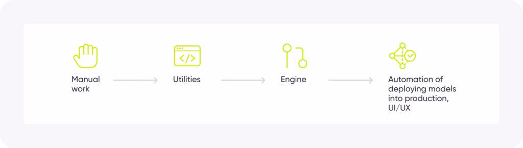 Die Notwendigkeit, diese Probleme von Projekt zu Projekt anzugehen, führte uns dazu, zunächst einen Satz von Hilfsprogrammen und dann einen Motor zur Beschleunigung des Entwicklungsprozesses typischer Lösungen mit Hilfe von Machine Learning zu erstellen. Dieser Ansatz hat die Entwicklungszeit von KI-basierten Projekten erheblich verkürzt, während die Qualität der Lösung hoch blieb.